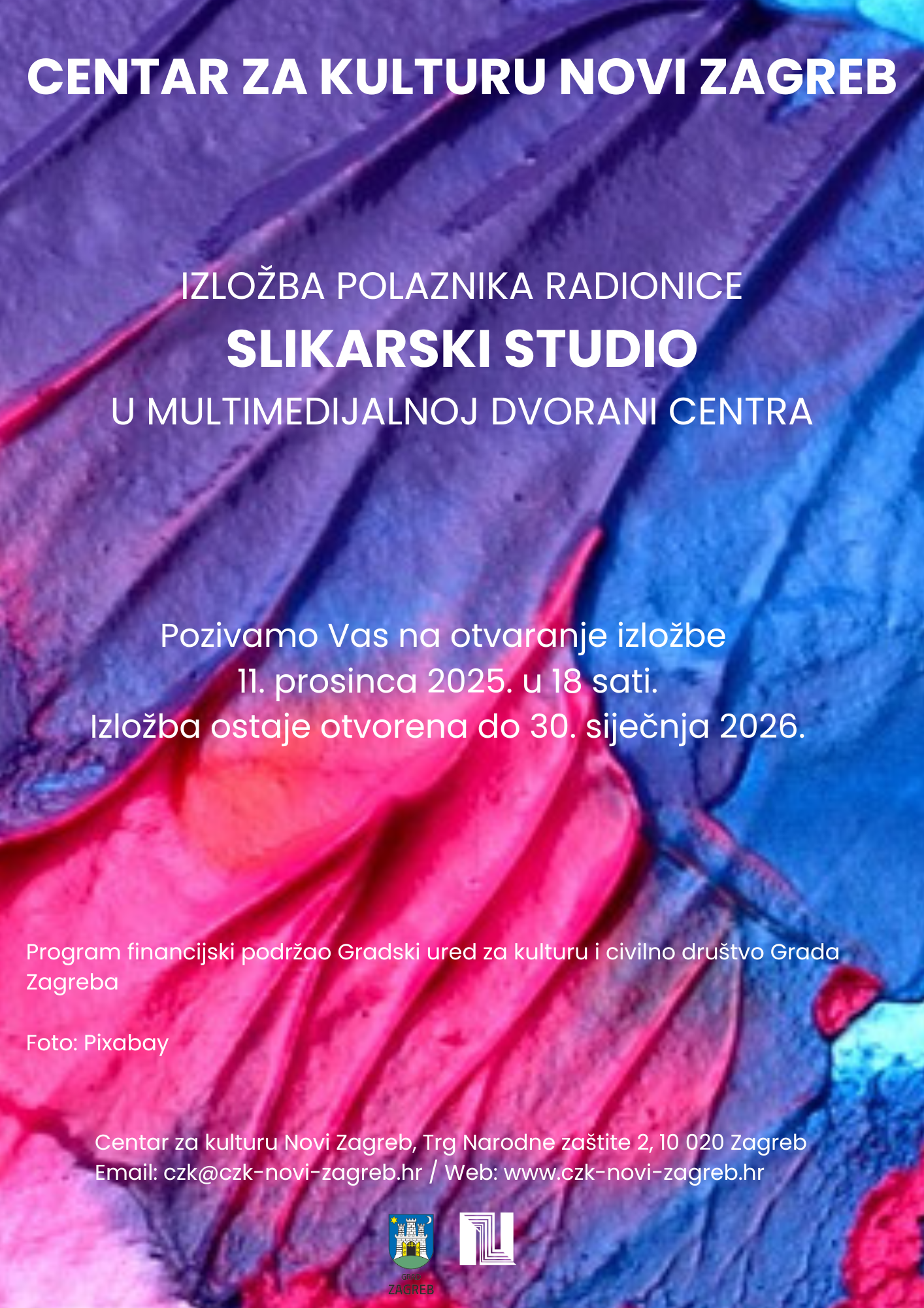 Pozivamo Vas na otvaranje izložbe polaznika likovne radionice za odrasle Slikarski studio u četvrtak 11. prosinca 2025. u 18 sati u Multimedijalnoj dvorani Centra za kulturu Novi Zagreb (Trg Narodne zaštite 2, Remetinec). Izložba ostaje otvorena do 30. siječnja 2026....