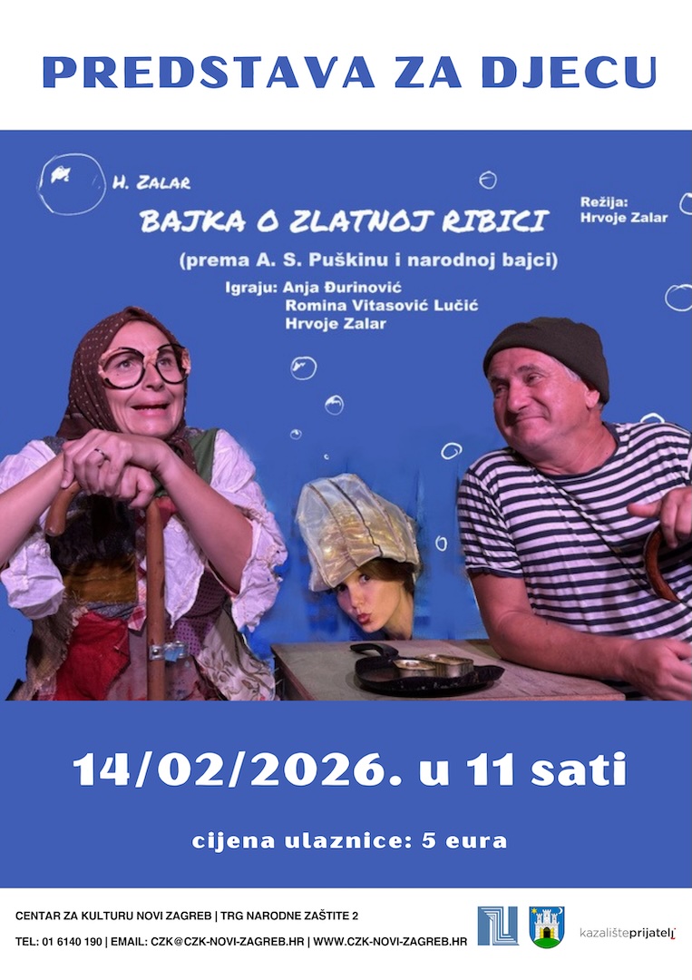 Subota, 14. veljače 2026.,11 sati Velika dvorana CZK (Trg Narodne zaštite 2) Predstava „Bajka o zlatnoj ribici“ autora Hrvoja Zalara nastala je prema motivima priče u stihovima A.S. Puškina (koju je on napisao prema motivima ruske narodne bajke, a pojavljuje se u...