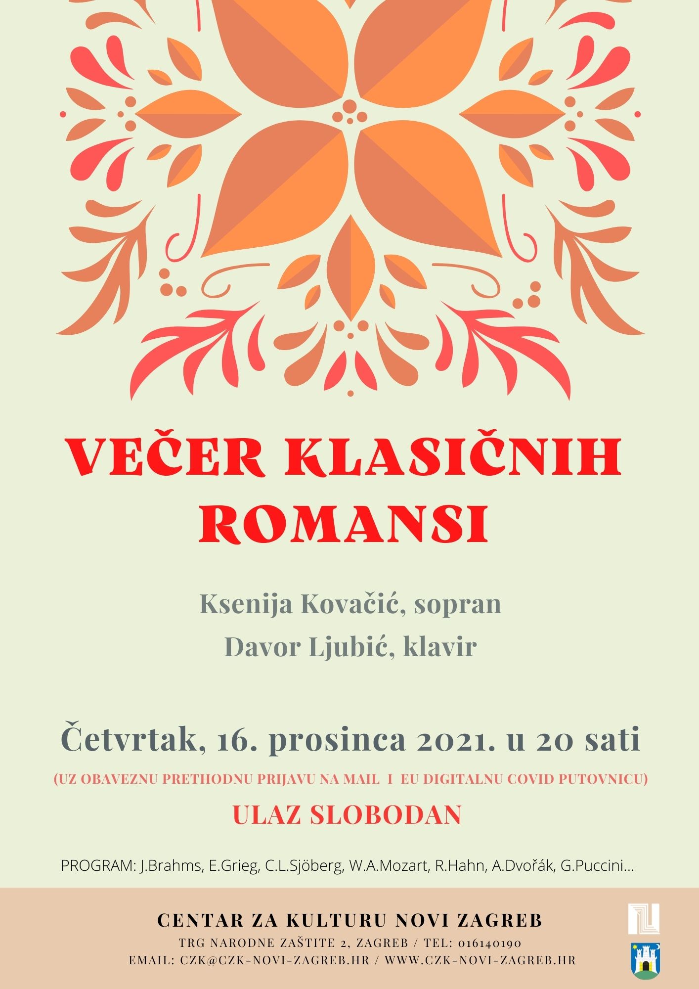 Ulaz je SLOBODAN, uz obaveznu prijavu na mail: marketing@czk-novi-zagreb.hr zbog ograničenog broja sjedala. Koncert se održava uz obavezno predočenje COVID potvrde.