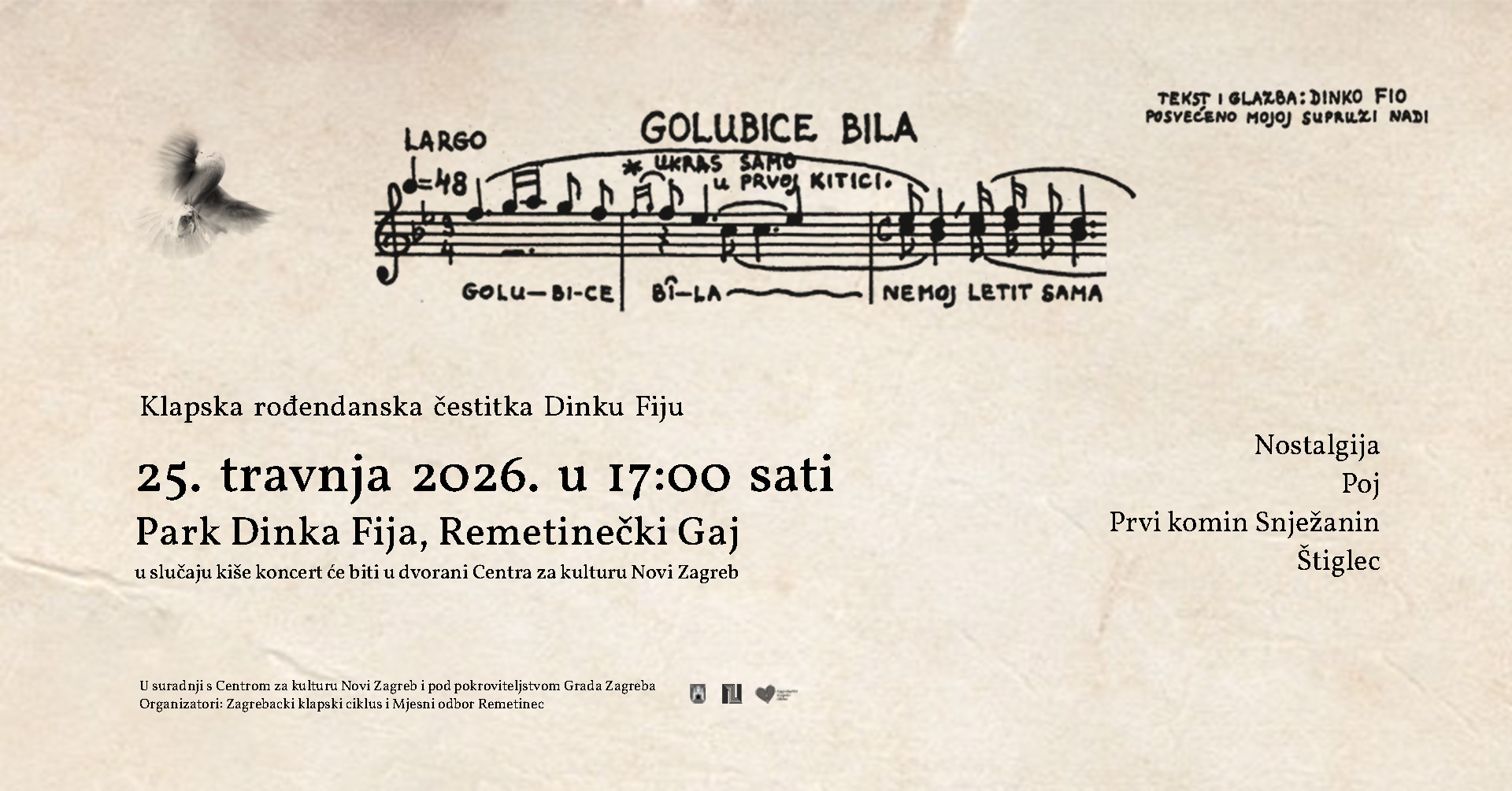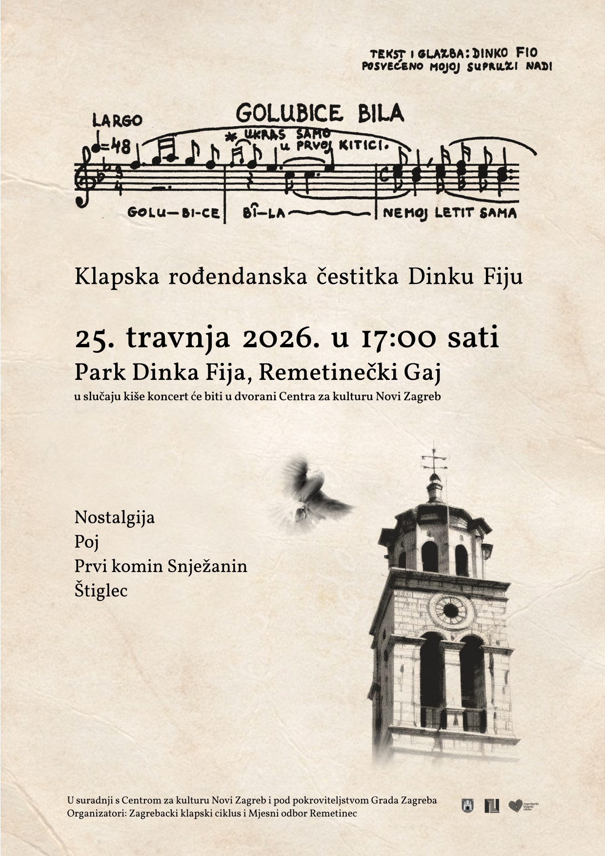 U subotu, 25. travnja 2026. u 17:00 sati zajedno ćemo poželjeti sretan 102. rođendan maestru Dinku Fiju — onako kako i dolikuje, uz 𝗸𝗹𝗮𝗽𝘀𝗸𝘂 𝗽𝗷𝗲𝘀𝗺𝘂 𝗶 𝗱𝗼𝗯𝗿𝗼 𝗱𝗿𝘂𝘀̌𝘁𝘃𝗼!
