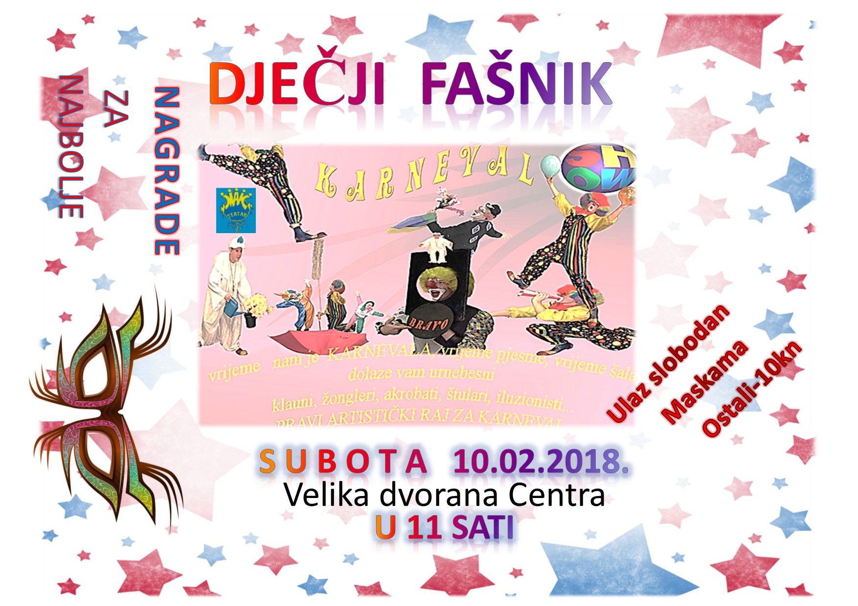 Centar za kulturu Novi Zagreb tradicionalno organizira fašničko veselje za djecu uz izbor najboljih maski. Fašnički meštar- iluzionist Ivica Krakić pobrinut će se za dobru zabavu. Na pozornici uz mimohod maski predstavit će se vokalne skupine Ivane Banfić i plesne skupine Slap i Pir. Za maskirane ulaz slobodan. Nakon izbora Naj maski, ples i krafne.