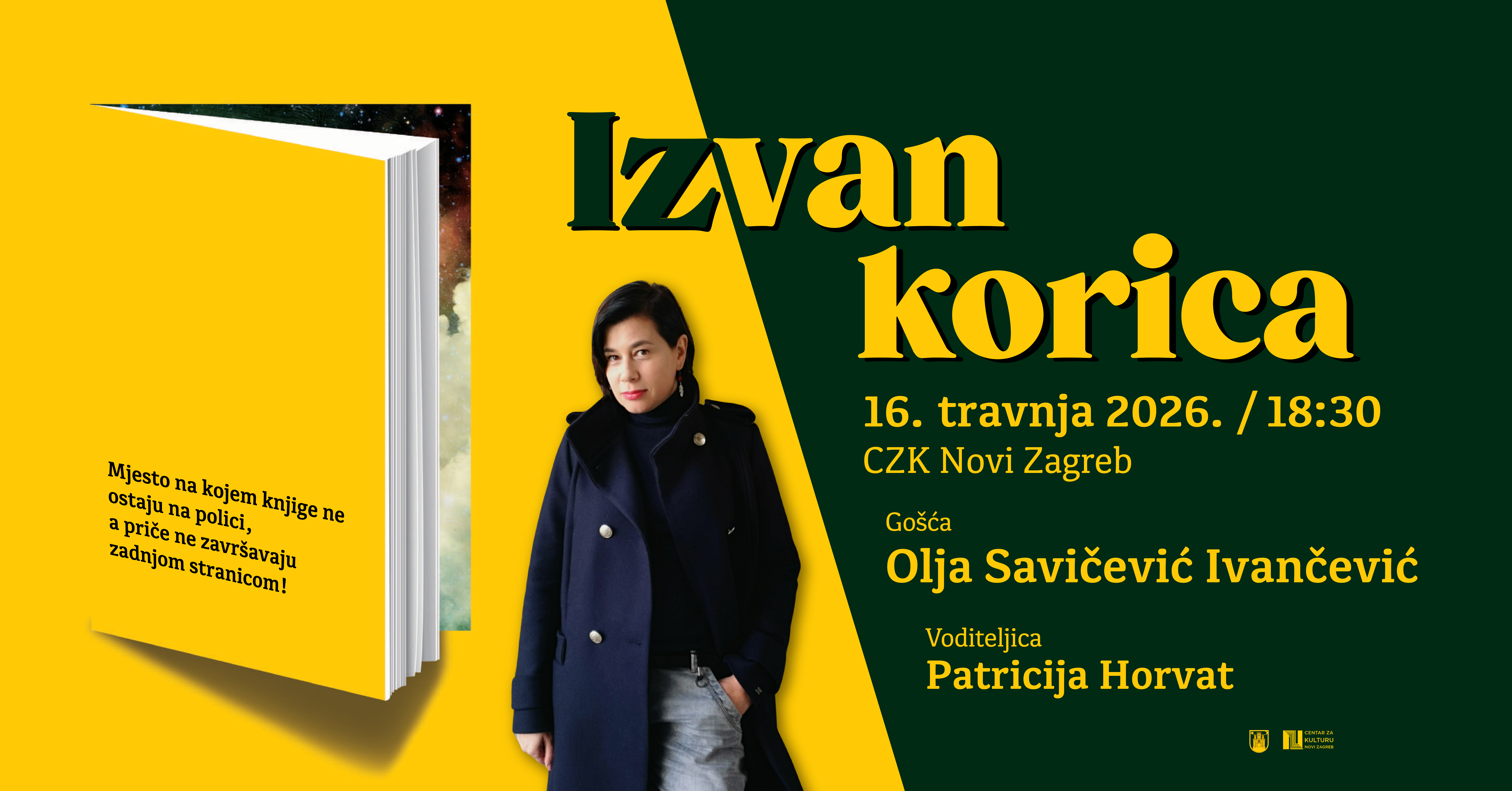 Treći po redu književni susret u sklopu ciklusa Izvan korica, u četvrtak, 16. travnja 2026. u 18:30 sati, donosi nam jednu od najznačajnijih glasova suvremene hrvatske književnosti – OLJU SAVIČEVIĆ IVANČEVIĆ. Večer će, kao i uvijek, voditi Patricija Horvat, prevoditeljica i umjetnička direktorica splitskog festivala pričanja priča Pričigin, koja je do sada na festivalima i tribinama širom regije predstavila više stotina autora i književnih djela.