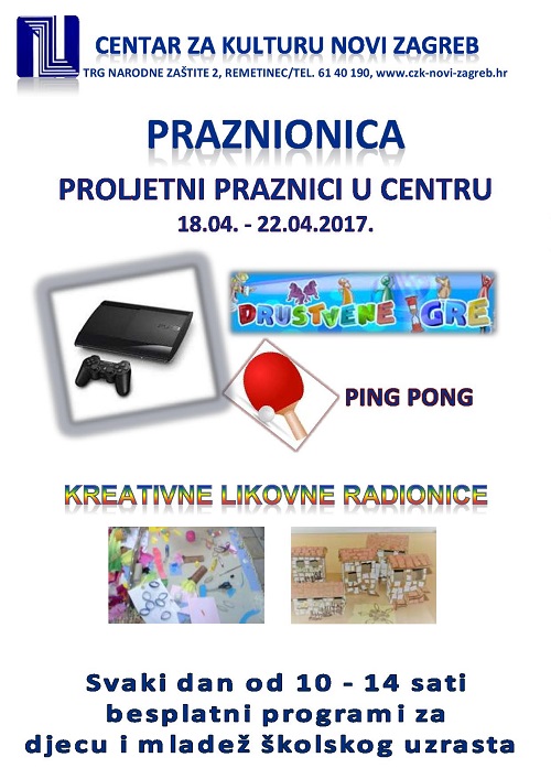 Pozivamo djecu i mladež školskog uzrasta da svoje proljetne praznike provedu uz “Prazionicu” Centra za kulturu Novi Zagreb. Uz društvene igre, playstation i ping – pong svaki dan u vremenu od 10- 14 sati očekuju ih i kreativne likovne radionice.