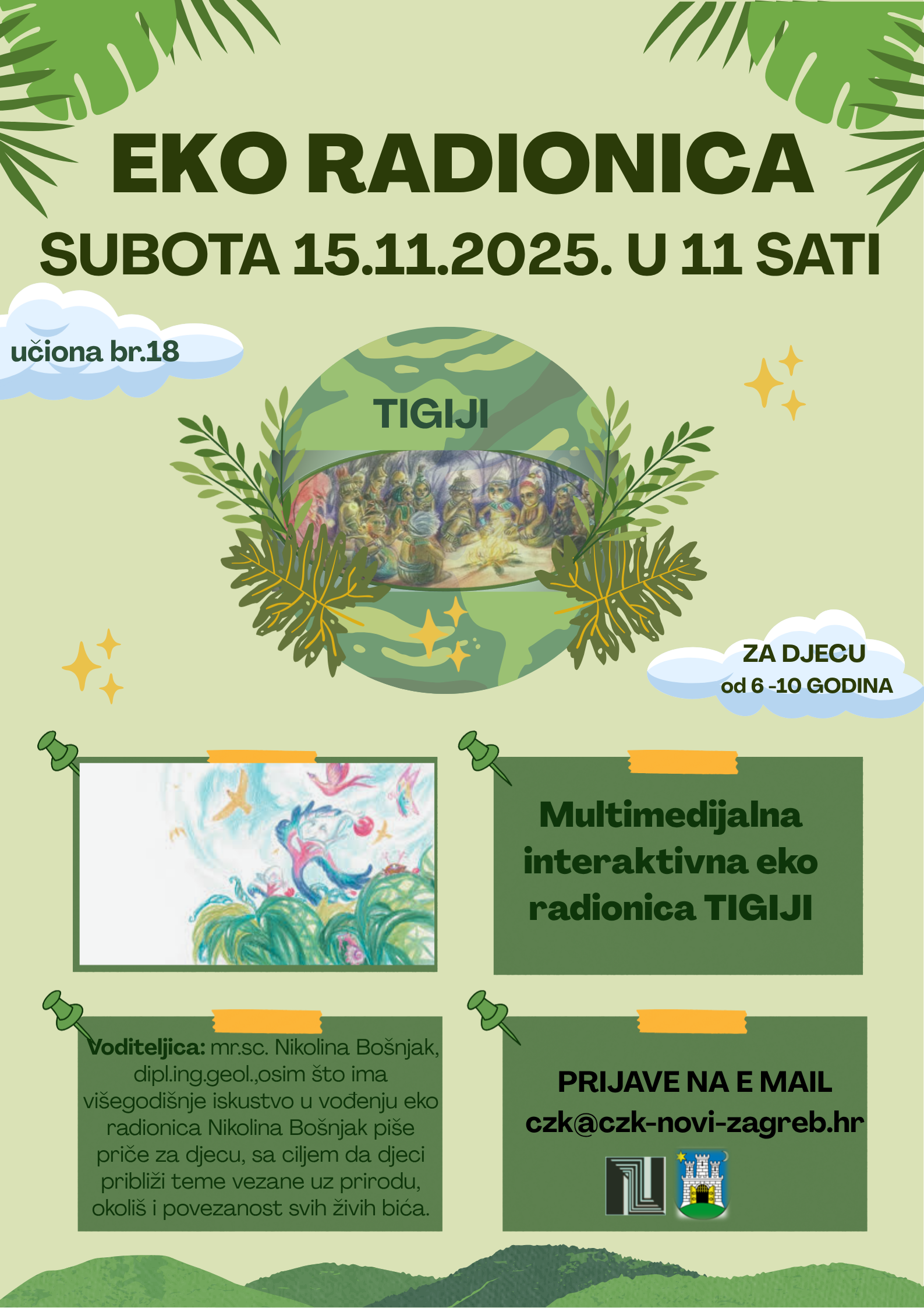Centar za kulturu Novi Zagreb organizira interaktivnu multimedijalnu eko radionicu ”Tigiji” namijenjenu djeci od 6 do 9 godina. Ovaj edukativni program spaja maštu, ekologiju i kreativnost kako bi najmlađima približio važnost zaštite okoliša. Radionice se temelje na ekološkim slikovnicama o Tigijima, likovima s planeta Tiga koji se suočavaju s izazovima zaštite prirode. Kroz elemente bajke i edukativni pristup, djeca uče o osobnoj odgovornosti prema okolišu i važnosti odvajanja otpada, štednje energije i vode. Slikovnice naglašavaju povezanost prirode, životinja i planeta kao cjeline.